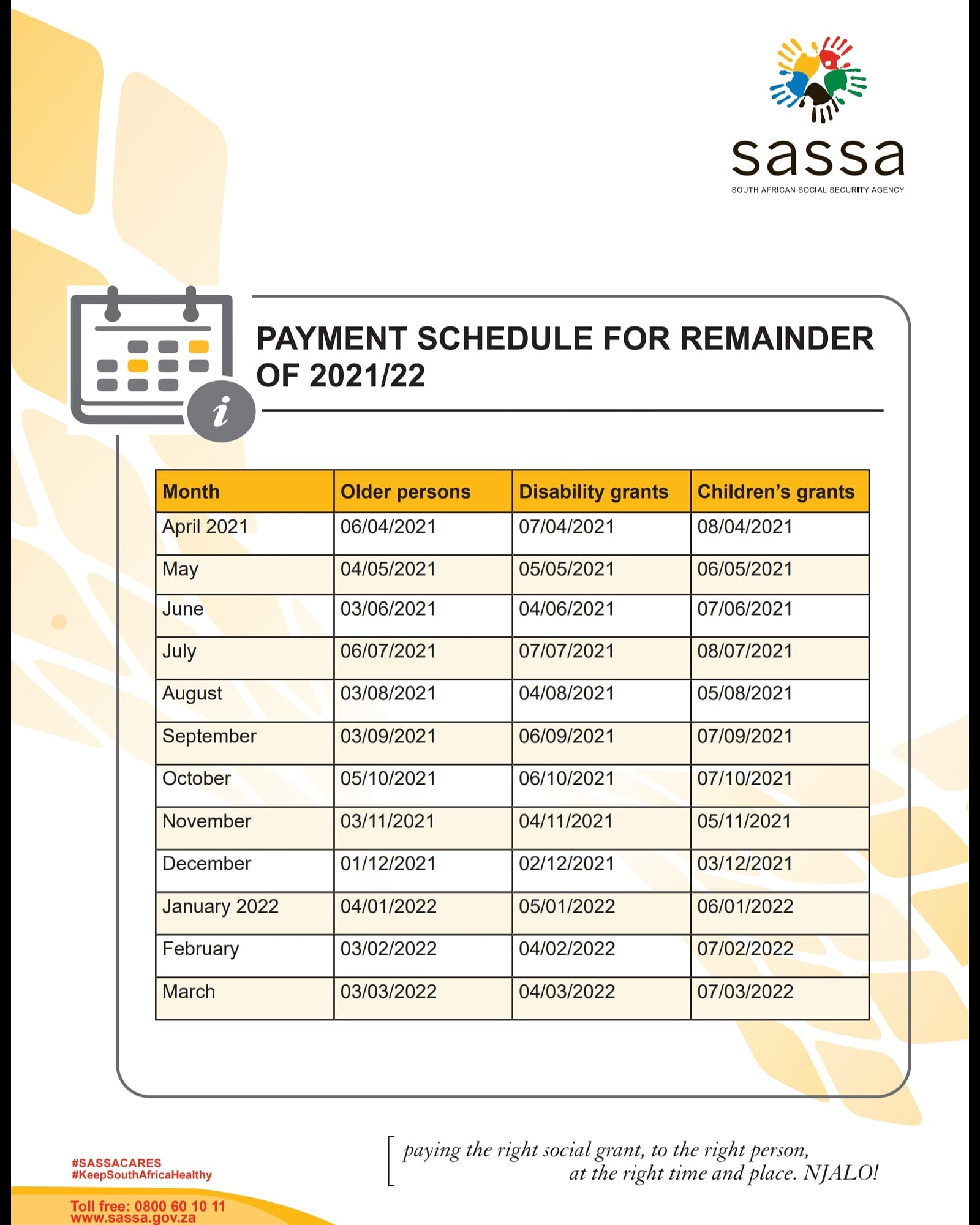 • Older Persons Grant: Payments will be made from October 3 to October 5, 2025.